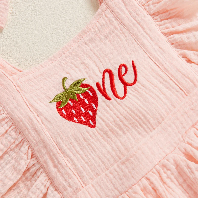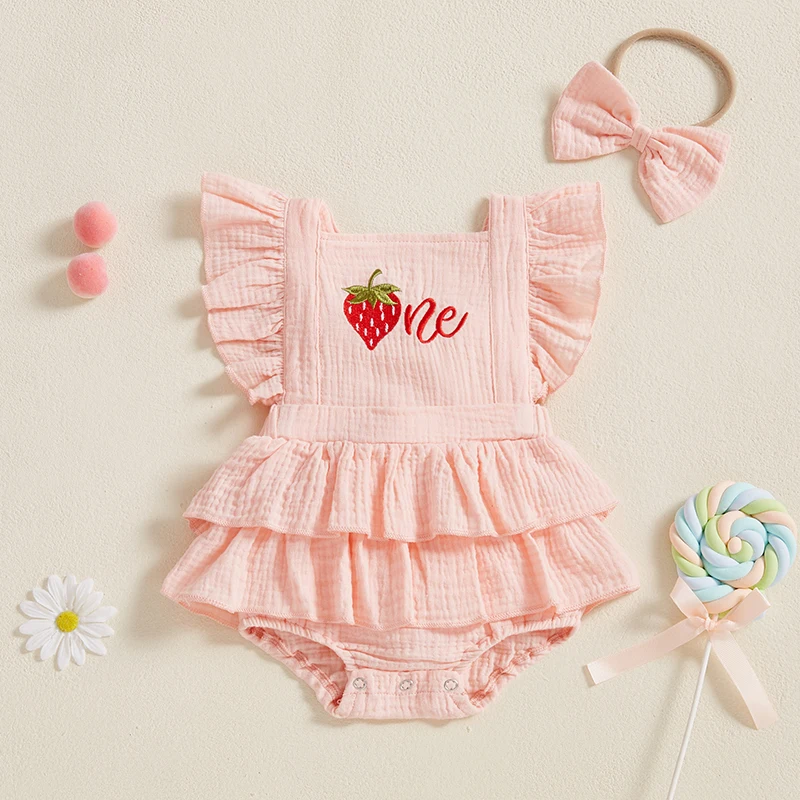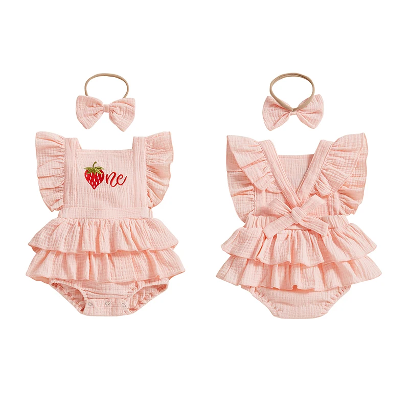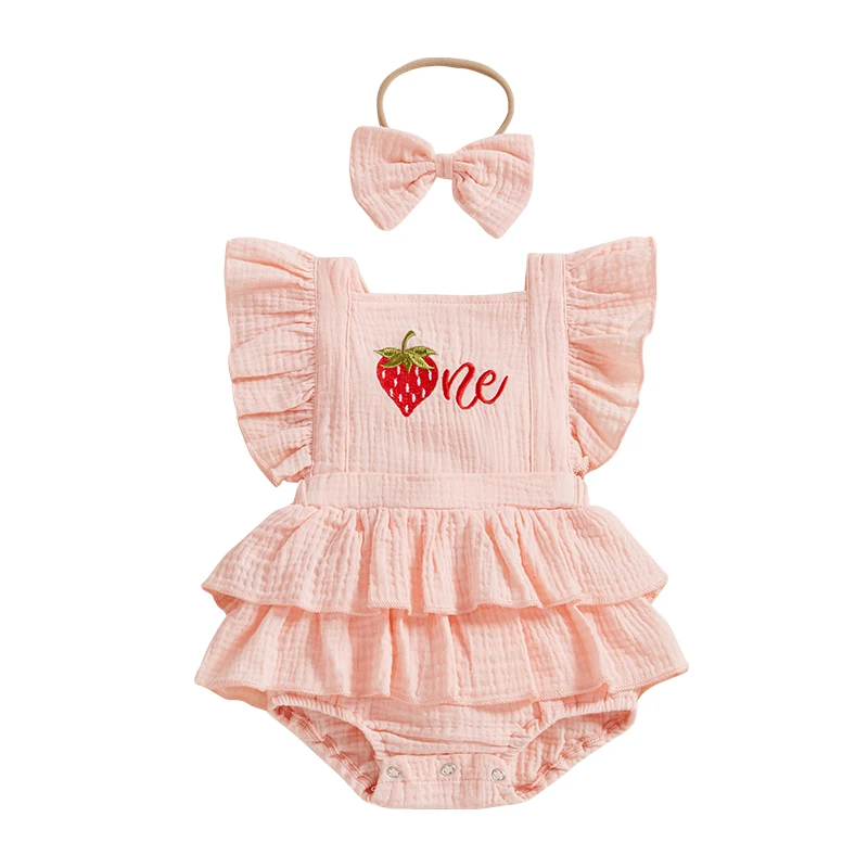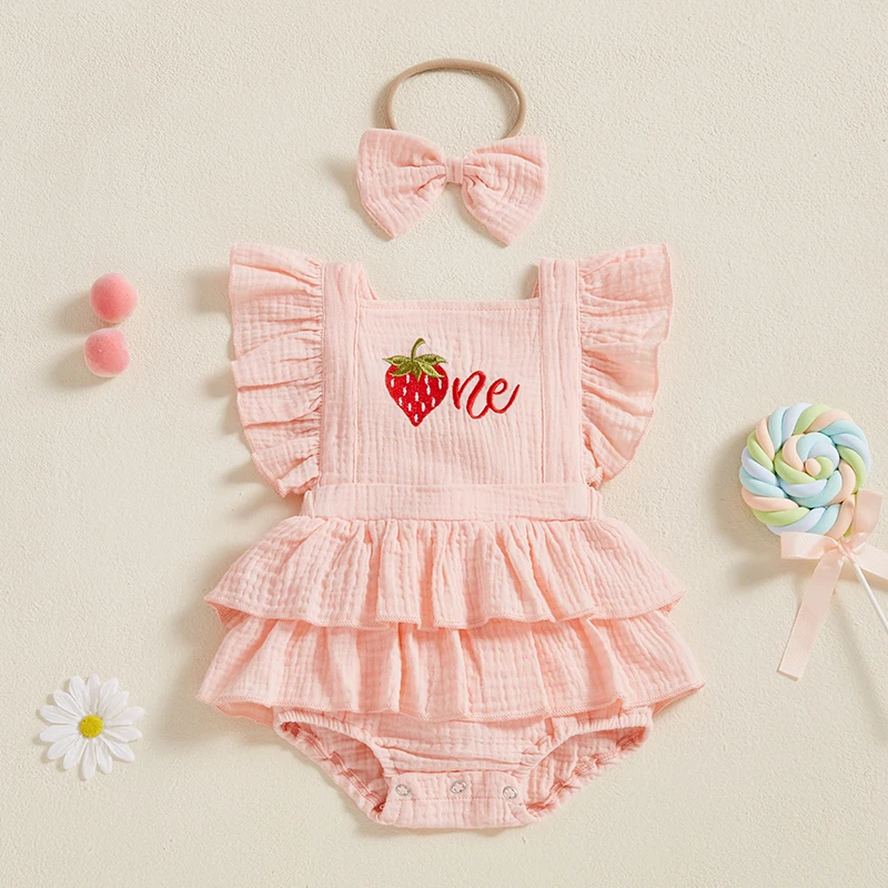 Baby Girl Summer Outfits Ruffle Sleeveless Strawberry Embroidery Romper with Headband Set Newborn Clothes