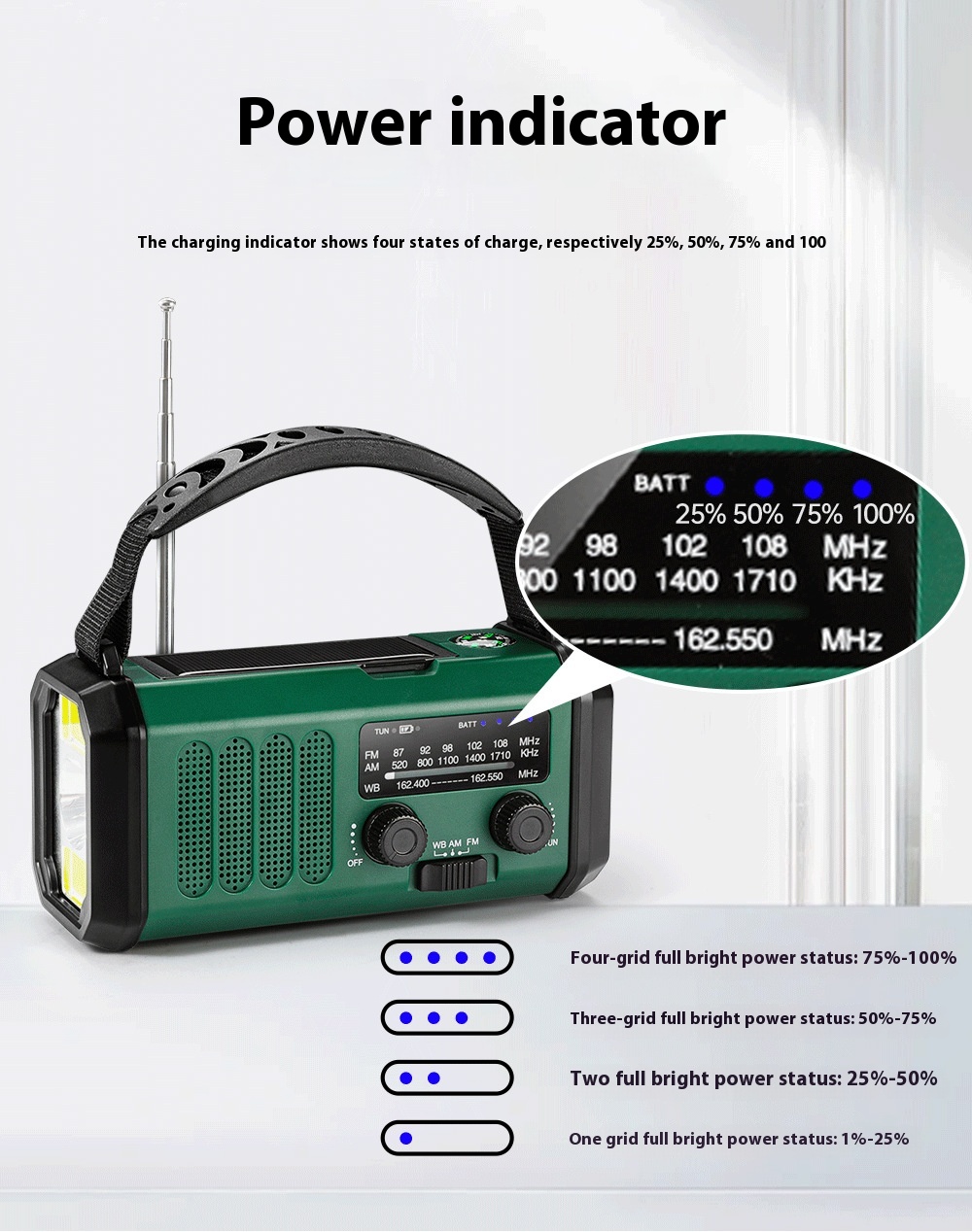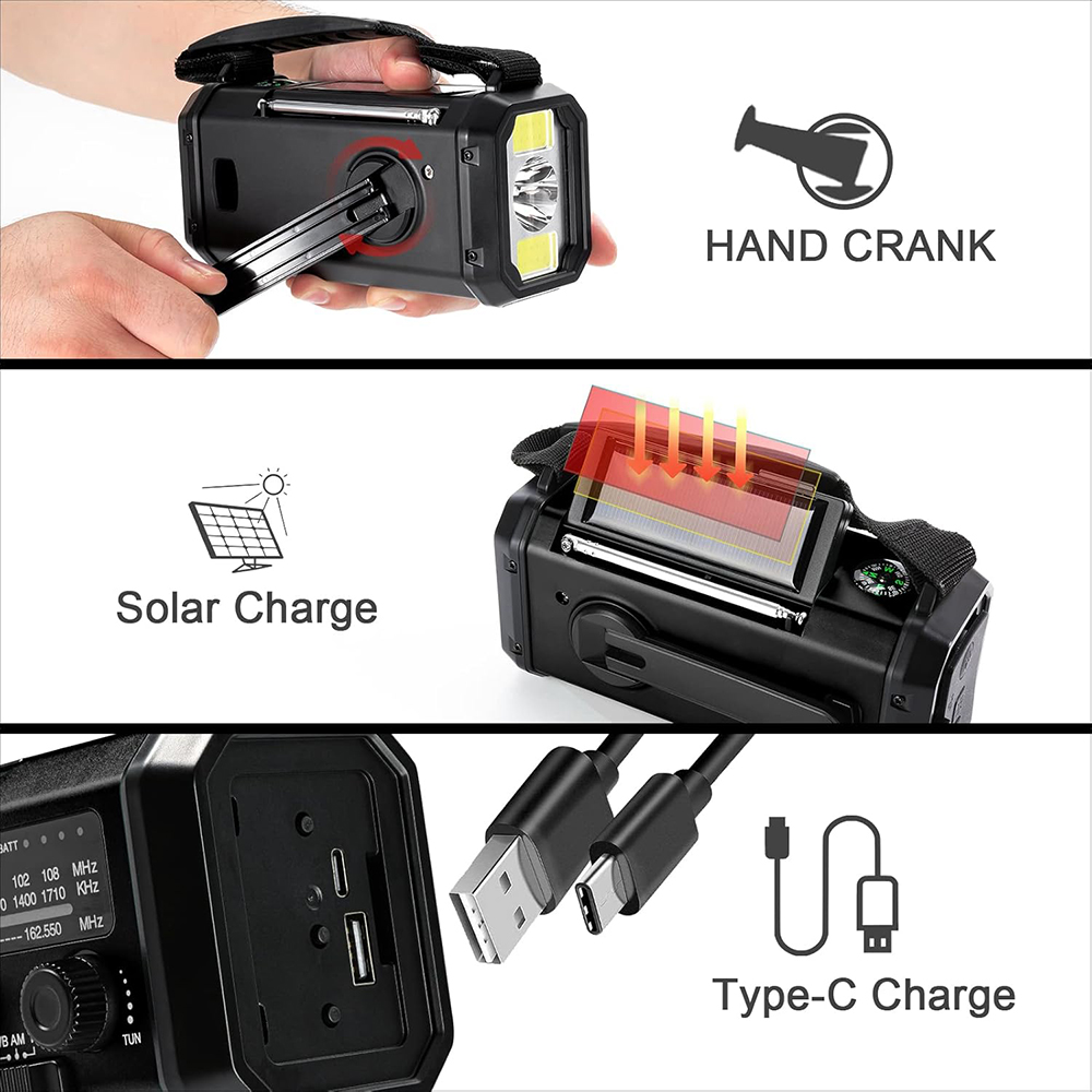 | Charging | USB charging, hand-cranked charging, solar charging |