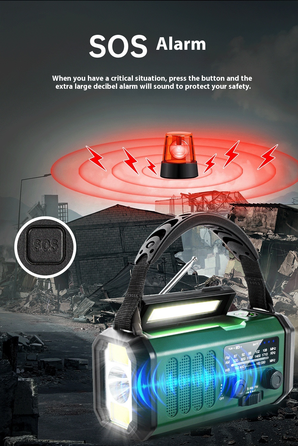 | Function | Flashlight (low/high), reading light, power bank, radio, siren |
