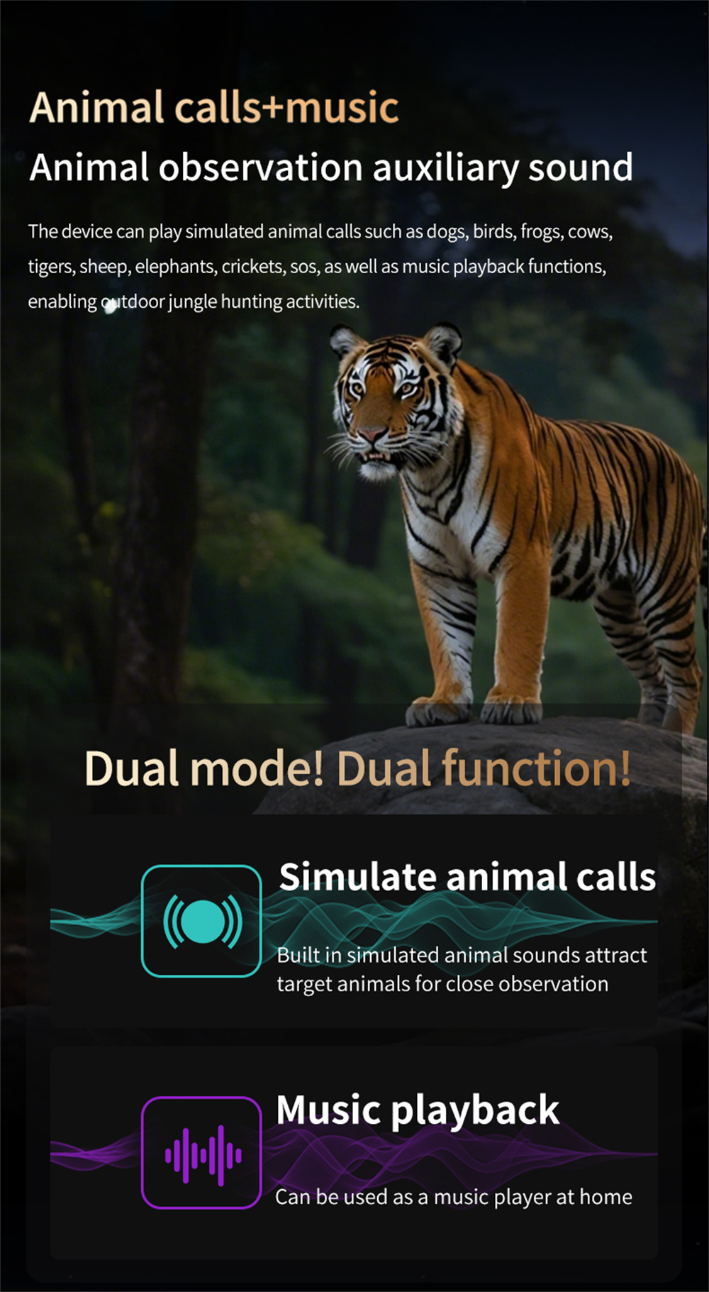 | Simulate Animal Calls | Dogs, bBirds, Frogs, Cows, Tigers, Sheep, Elephants,Crickets, SOS Calls |