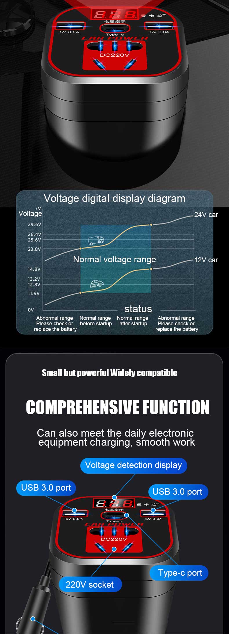 3. Comprehensive Function: Apart from its primary function as a car inverter, this device can also be used to charge various electronic equipment, making it versatile for daily use.