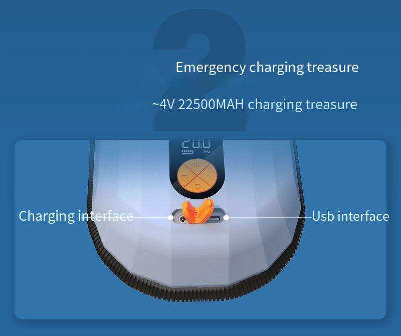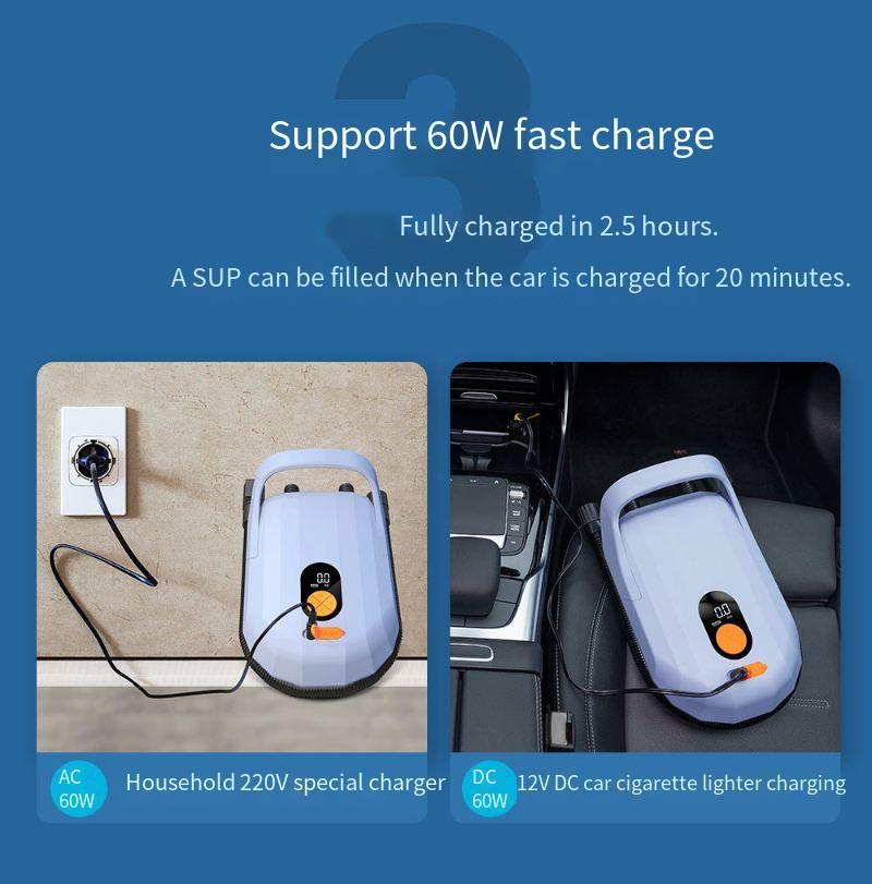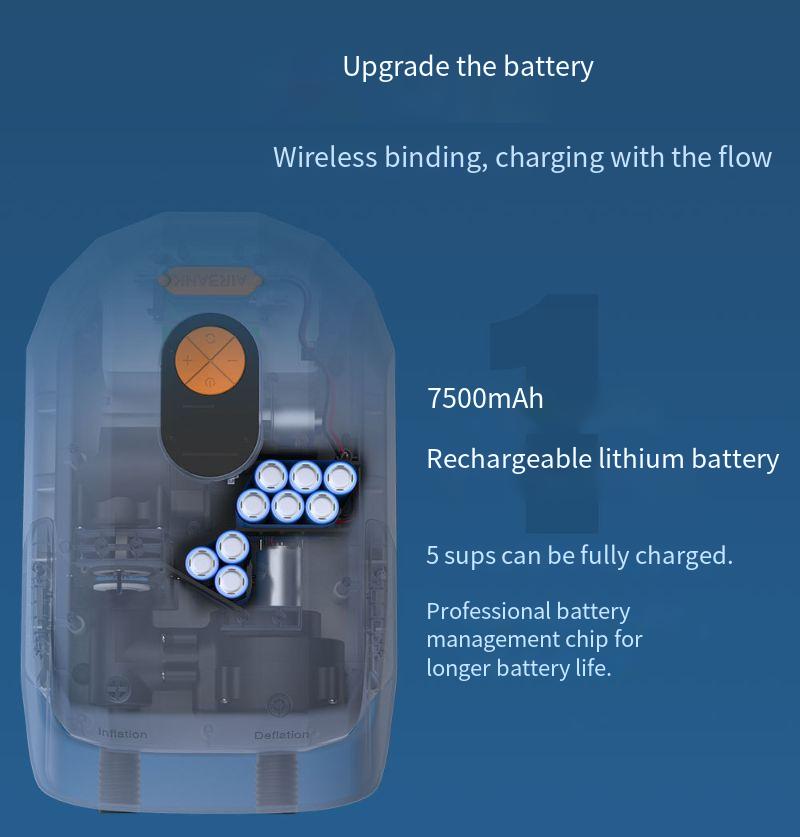 1. 7500mAh Rechargeable Lithium Battery: The Inflatable Pump is equipped with a high-capacity rechargeable lithium battery, ensuring long-lasting power and eliminating the need for external power sources.