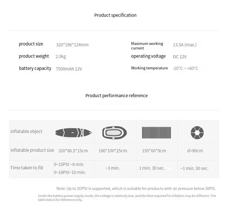 2. Up to 20PSI: Capable of providing air pressure of up to 20PSI, making it suitable for inflating various items such as inflatable mattresses, boats, toys, or sports equipment efficiently and quickly.