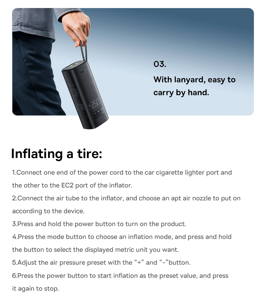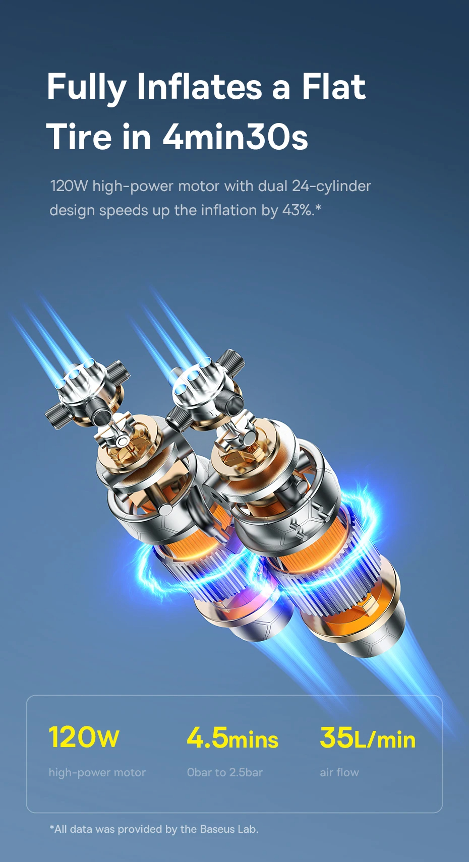 120W high-power motor with dual 24-cylinder design speeds up the inflation by 43%.