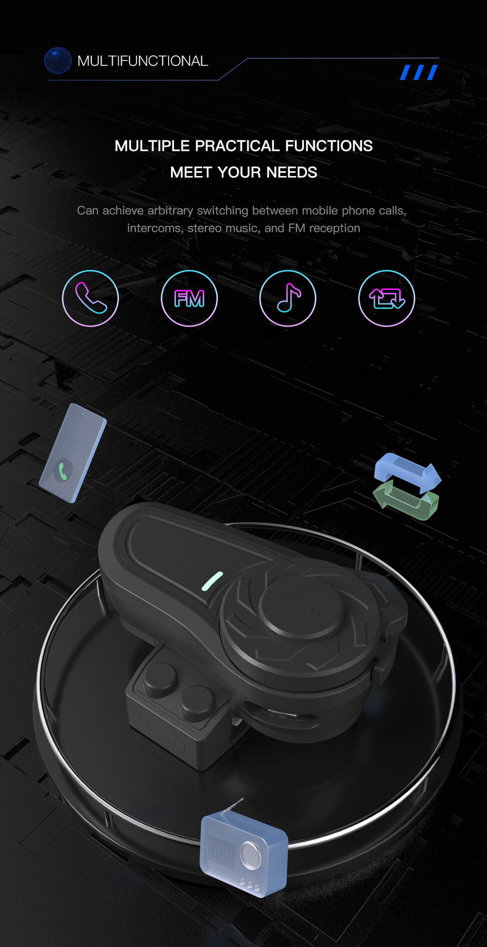 motorcycle riders, which meets people’s functional requirements such as intercom, answering phone calls, listening to music, listening to FM radio and receiving GPS