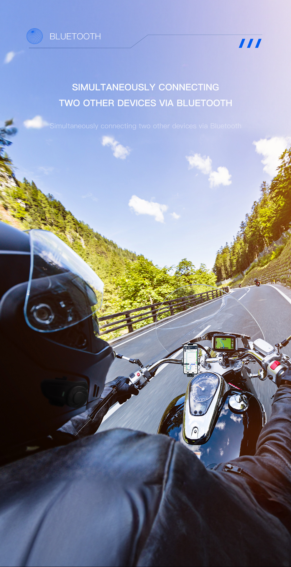 (10)Connect 2 other devices (mobile phone, MP3, GPS) via Bluetooth;