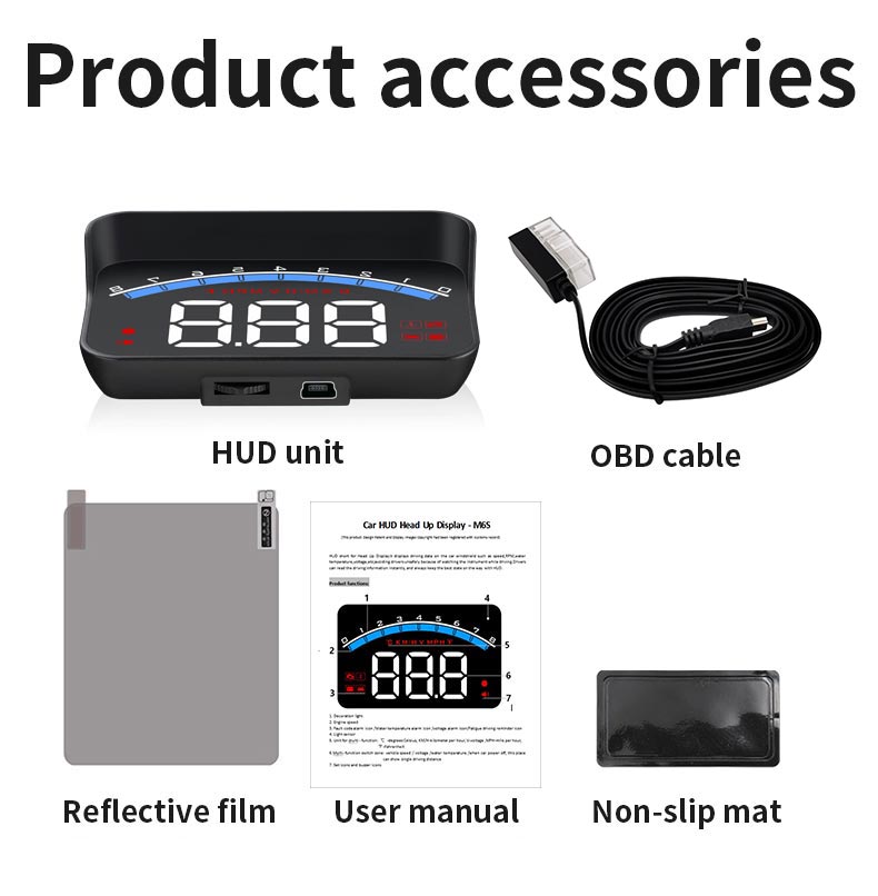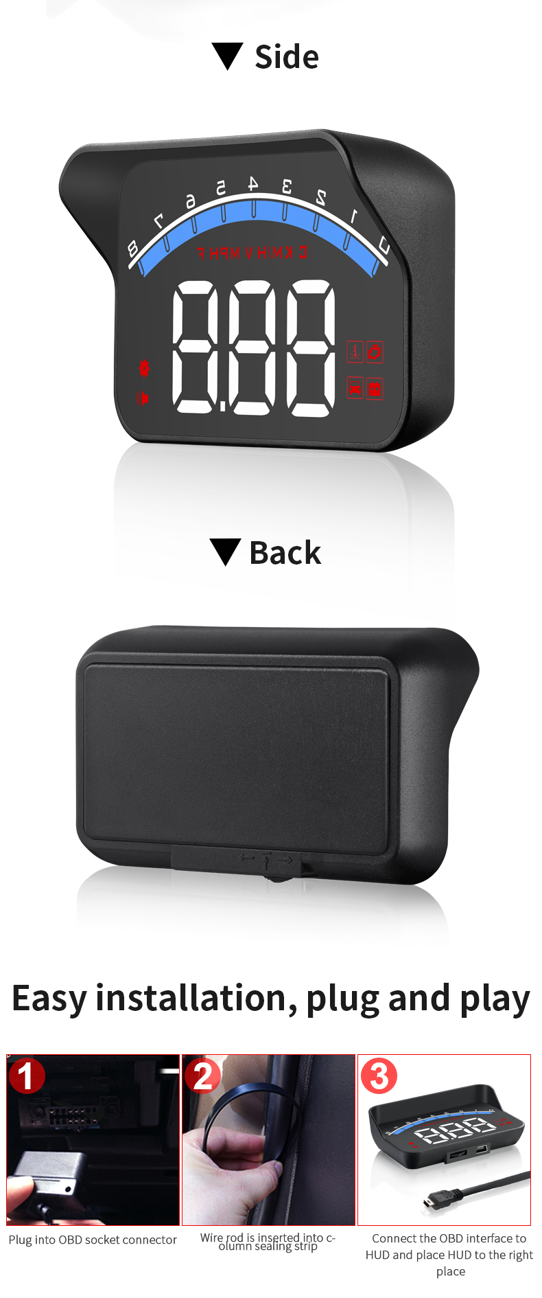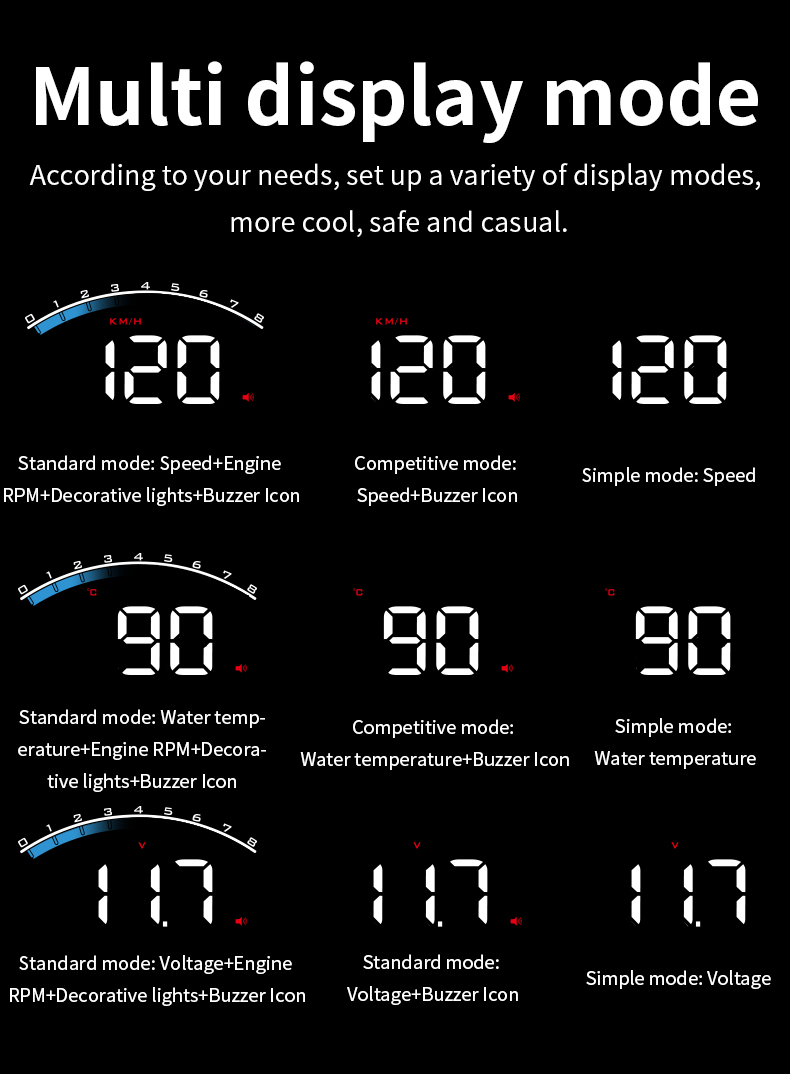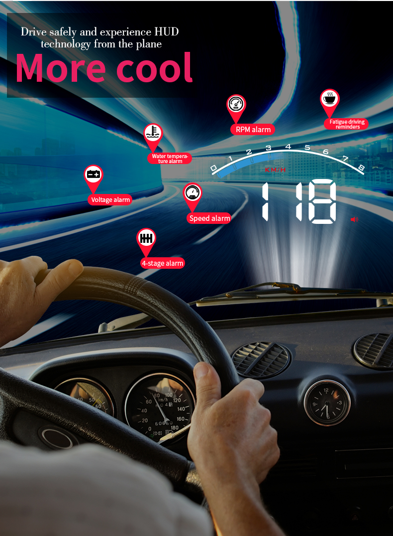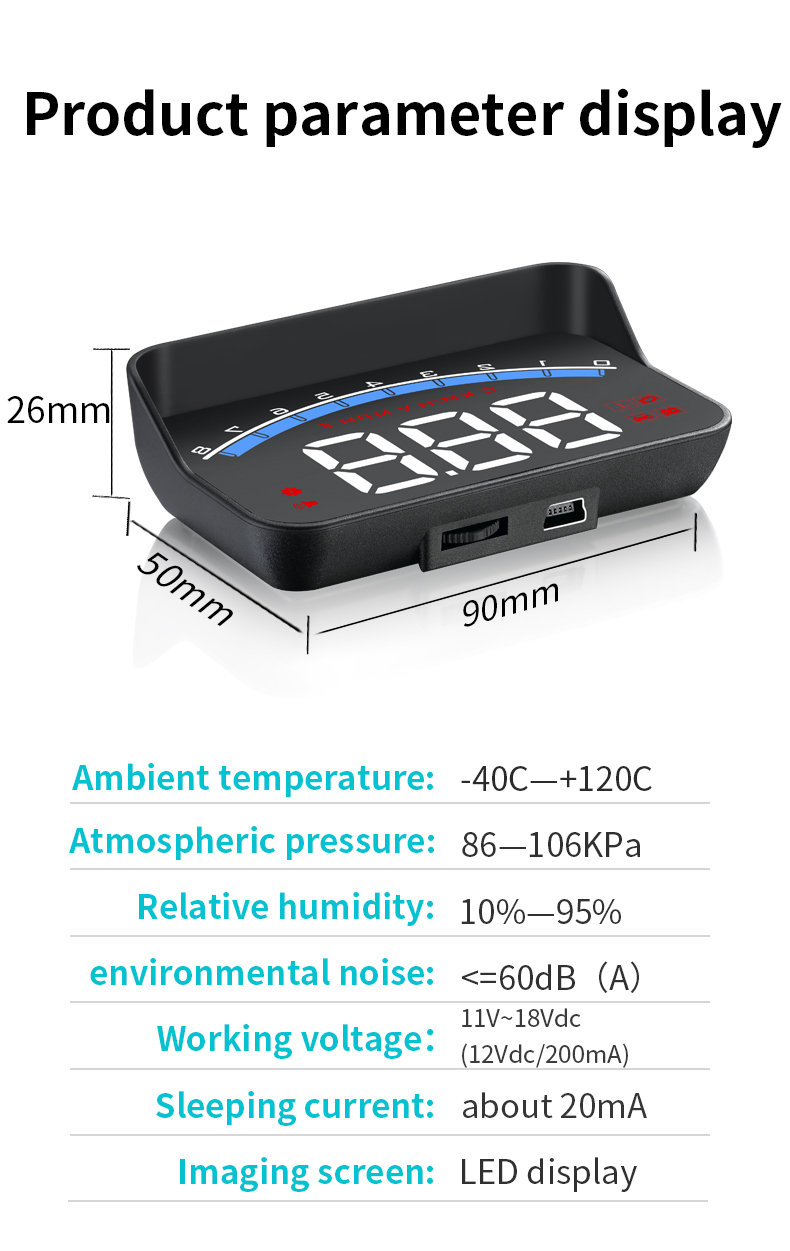 — Multiple alarm modes: car windshield speedometer head-up display overspeed alarm, car head-up display voltage alarm, digital speedometer water temperature alarm, car head-up display fatigue driving reminder, fault alarm.