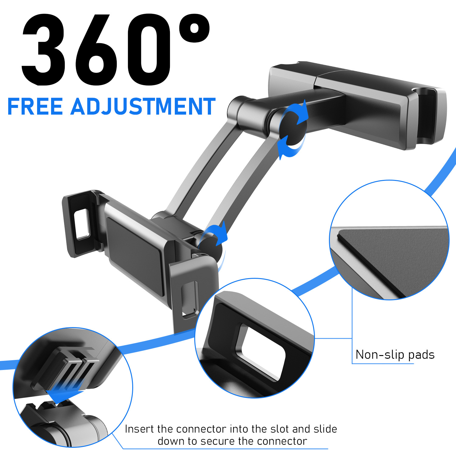 Universal Car Tablet Holder for Headrests Car Rear Tablet Holder 360-Degree Rotating Rear Seat Holder Retractable Mobile Phone Support Clip