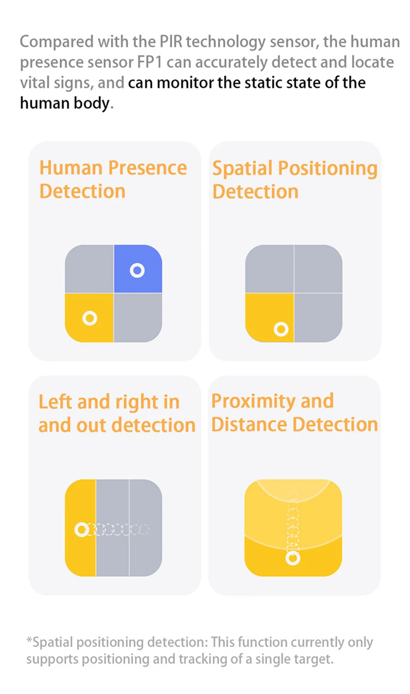 5.Compared with the PIR technology sensor, the human presence sensor FP1 can accurately detect and locate vital signs, monitor the state of the static human body, and accurately determine whether the scene exists or not.