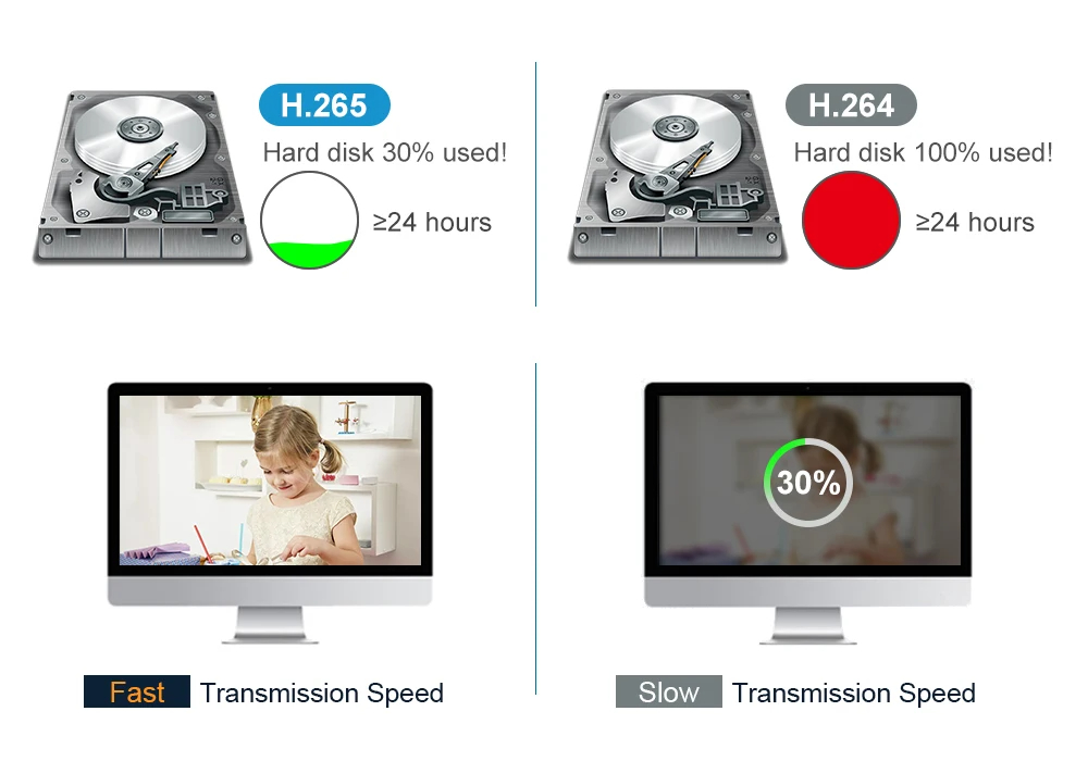 5. Efficient H.265 video compression technology for longer recording times and less storage space consumption.