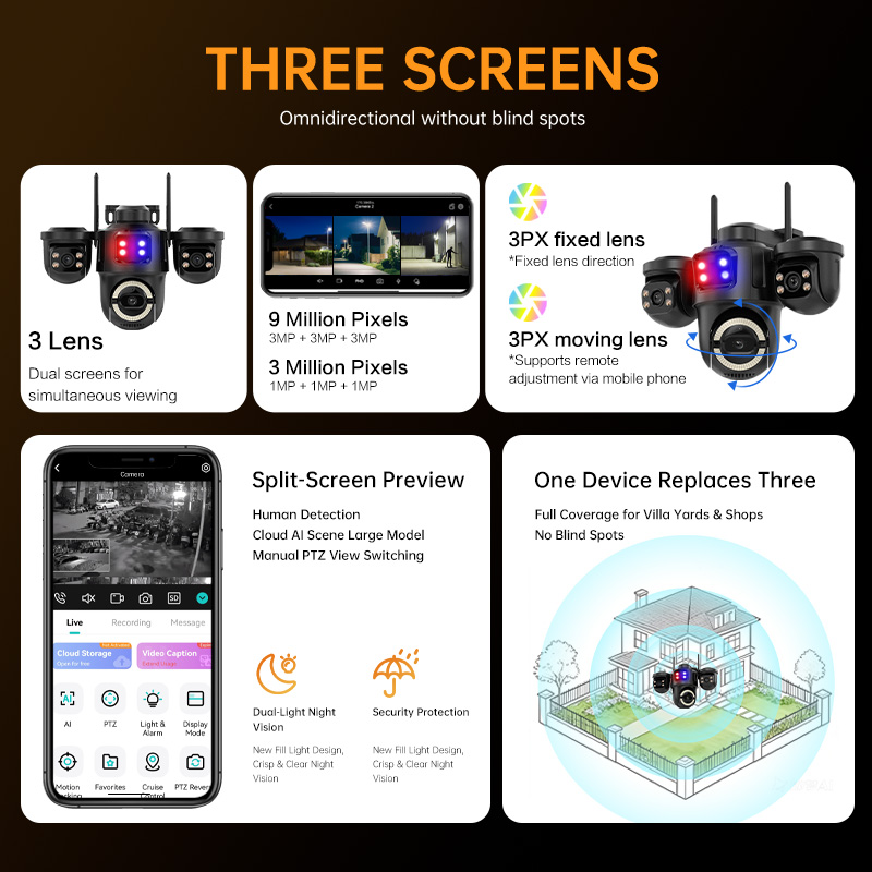 1. Three-Screen Monitoring: Dual and split-screen preview for simultaneous viewing of different areas.
