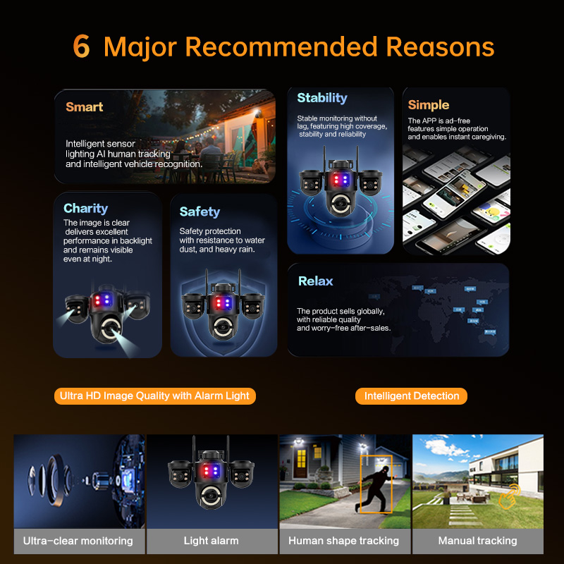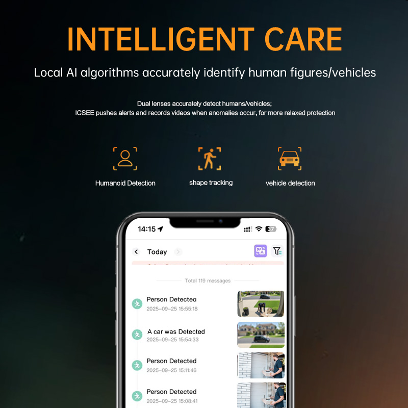 AI Detections: Human shape and vehicle recognition with automatic tracking and alerts.